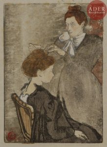 Maurice DELCOURT - La Coiffure. 1899. Bois gravé. 138 x 99. I.F.F. 4. Très belle épreuve sur japon vergé, timbrée, signée au crayon et datée « février 1899 ». Nombreuses rousseurs et traces de plis aux bords du feuillet. Semis de...
