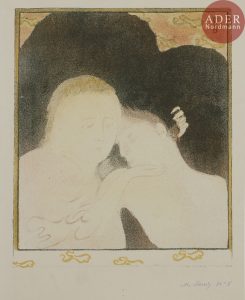 Maurice DENIS - Tendresse, ou Madeleine. 1893. Lithographie. 301 x 251. Cailler 70. Impression en couleurs. Très belle épreuve sur vélin, signée et numérotée à la plume et à l’encre violette. Empoussiérage et quelques plis cassés en...