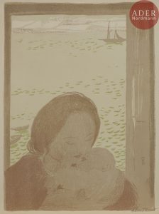 Maurice DENIS - Maternité devant la mer, ou Maternité au Pouldu. 1900. Lithographie. 347 x 250. Cailler 120. Impression en couleurs. Très belle épreuve sur vélin blanc glacé, exceptionnellement signée au crayon. Fin court pli cassé vertical...