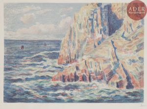 Maximilien LUCE - Les Rochers rouges, ou La Mer à Camaret. 1895. Lithographie. 396 x 440. I.F.F. 16. Impression en couleurs. Très belle épreuve sur chine collé sur vélin fort, signée au crayon bleu, numérotée, paraphée et timbrée par...