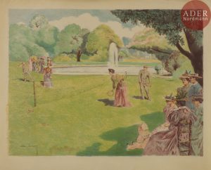 Alexandre LUNOIS - La Partie de volant, ou Lawn Tennis. 1898. Lithographie. 380 x 503. I.F.F. 68 ; Johnson 74. Impression en couleurs. Très belle et fraîche épreuve sur vélin mince chamois, signée au crayon dans le sujet en bas à gauche....