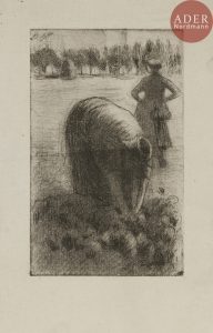 Camille PISSARO - Femme cueillant des choux. 1888. Eau-forte. 98 x 60. Delteil 77. Très belle et unique épreuve sur vergé, du 6e état (sur 7), tirée légèrement de guingois, annotée en pied au crayon « 6e état ». Toutes marges. Tirage...