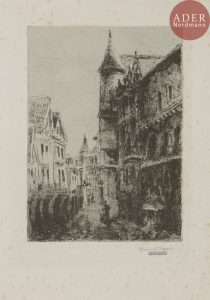 Camille PISSARO - Rue Saint-Romain à Rouen (1re pl.). 1896. Zincographie. 186 x 140. Delteil 176. Très belle épreuve sur bulle verdâtre appliqué, annotée « Epreuve d’Essai » au crayon et revêtue du timbre de l’imprimeur Tailliardat...