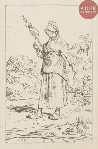 Jean-François MILLET (d’après) - Femme vidant un seau ; Bêcheur au repos ; Fileuse auvergnate. Gravure sur bois (les deux premiers sujets par Pierre Millet). Formats divers. Delteil 32, 34 et non décrit. Belles ou bonnes épreuves sur...