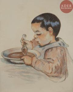 Armand GUILLAUMIN - Portrait d’Armand, ou Enfant mangeant sa soupe. Vers 1895. Lithographie. 425 x 440. Johnson 63 ; Kraemer 19. Impression en couleurs. Très belle et fraîche épreuve sur vergé crème, signée à la pierre noire. Court pli...