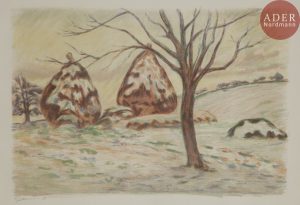 Armand GUILLAUMIN - Paysage aux meules, ou Les Meules en hiver à Palaiseau. 1898. Lithographie. 353 x 515. Kraemer 22. Impression en couleurs. Très belle et fraîche épreuve sur vergé crème filigrané « mbm », signée et numérotée à la...
