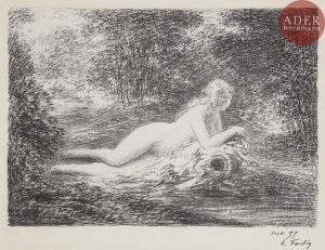 Henri FANTIN-LATOUR - La Source dans les bois. 1898. Autographie. 300 x 422. Hédiard-Mason 139 ; Johnson 41-2. Réunion de 3 belles épreuves, l’une tirée en bistre sur japon fort, les deux autres tirées en noir sur chine appliqué (l’une...