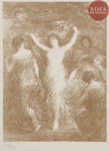 Henri FANTIN-LATOUR - Danses. 1898. Autographie. 437 x 323. Hédiard-Mason 140 ; Johnson 41-3. Très belle épreuve exceptionnellement tirée en bistre sur vélin crème. Fort empoussiérage marginal. Plis cassés en pied. Toutes marges. Tirage à...