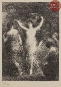 Henri FANTIN-LATOUR - Danses. 1898. Autographie. 437 x 323. Hédiard-Mason 140 ; Johnson 41-3. Très belle épreuve sur japon vergé. Fort empoussiérage marginal. Rousseurs et plis cassés. Toutes marges. Tirage à 100 épreuves. A. Vollard éd.