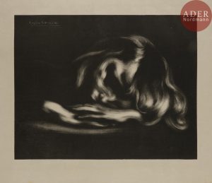 Eugène CARRIÈRE - Le Sommeil (jean-René Carrière). 1897. Lithographie. 340 x 433. Delteil 36 ; Johnson 21. Très belle épreuve d’essai sur japon vergé. Quelques infimes points blancs (défauts d’encrage) dans le fond noir. Légère...