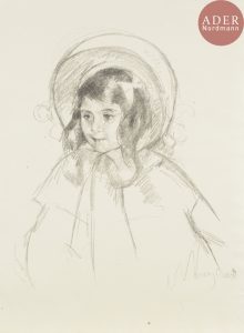 Mary CASSATT - Sara Wearing her Bonnet and Coat. Vers 1904. Autographie. 505 x 417. Breeskin 198. Très belle et fraîche épreuve sur vergé mince filigrané « mbm ». Quelques infimes taches d’encre et points de rouille. Toutes marges non...