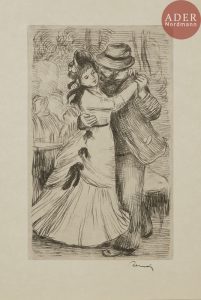 Pierre-Auguste RENOIR - La Danse à la campagne (2e pl.). Vers 1890. Vernis mou. 220 x 138. Delteil, Stella 2. Très belle et fraîche épreuve sur japon, timbrée (Lugt 2137a). Infime oxydation aux bords du feuillet. Minuscule tache circulaire en...