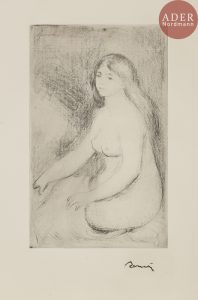 Pierre-Auguste RENOIR - Baigneuse assise. Vers 1897. Vernis mou. 219 x 138. Delteil, Stella 11. Très belle épreuve sur vélin crème fort, timbrée (Lugt 2137b). Quelques rares rousseurs claires. Toutes marges. Tirage pour La Vie et l’œuvre...