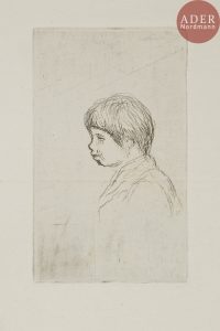 Pierre-Auguste RENOIR - Claude Renoir, fils de l’artiste, de profil. 1908. Eau-forte sur zinc. 153 x 90. Delteil, Stella 19. Réunion de 2 très belles épreuves, l’une sur vergé ancien, avec éraillures obliques dans la partie supérieure de...