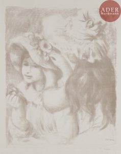 Pierre-Auguste RENOIR - Le Chapeau épinglé (2e pl.). 1898. Lithographie. 622 x 500. Delteil, Stella 30 ; Johnson 108. Impression en bistre violacé. Très belle épreuve sur chine volant, revêtue d’une seconde signature lithographiée....