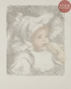 Pierre-Auguste RENOIR - L’Enfant au biscuit (Jean Renoir). Vers 1898-1899. Lithographie. 318 x 267. Delteil, Stella 31 ; Johnson 110. Très belle et fraîche épreuve tirée en deux tons (gris et rose pâle) sur vergé filigrané « mbm »....