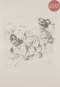 Pierre-Auguste RENOIR - Les Enfants jouant à la balle. 1900. Lithographie. 506 x 506. Delteil, Stella 32 ; Johnson 111. Impression en noir. Très belle et fraîche épreuve sur vergé filigrané « mbm », l’indentation de la pierre très...
