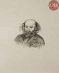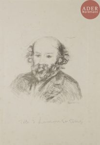 Pierre-Auguste RENOIR - Paul Cézanne. Vers 1902. Lithographie. 325 x 240. Delteil, Stella 34 ; Johnson 115. Très belle épreuve sur chine volant, du 1er état (sur 2), avant effaçage de l’inscription lithographiée en pied et d’un défaut...