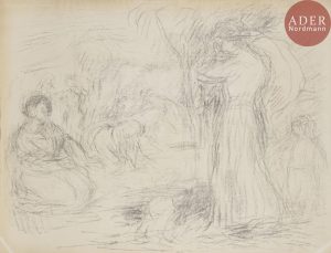 Pierre-Auguste RENOIR - Les Laveuses, 1re pensée. Autographie. 468 x 610. Delteil, Stella 52. Belle épreuve sur vergé filigrané « mbm ». Oxydation du feuillet (avec petites bandes blanches obliques dans les angles inférieurs). Toutes marges.