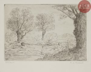 Ker-Xavier ROUSSEL - Satyre et nymphe se baignant dans un étang. Eau-forte et pointe sèche. 169 x 242. Salomon 98. Très belles épreuves d’états sur vélin, annotées « 1er Essai » et « 2em Essai » au crayon. Toutes marges. Ens. 2 p.