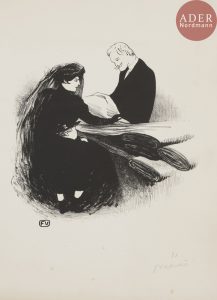Félix VALLOTTON - Dernière nouveauté. 1893. Lithographie. 215 x 217. Vallotton et Goerg 44. Très belle épreuve sur vélin glacé crème, numérotée et signée au crayon bleu. Quelques rousseurs claires et léger empoussiérage dans l’angle...