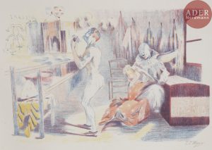 T. P. WAGNER - La Loge des clowns. 1897. Lithographie. 330 x 495. Johnson 158. Impression en couleurs. Très belle et fraîche épreuve sur chine volant, signée au crayon. Toutes marges.