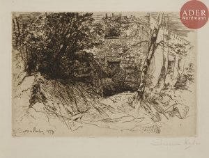 Sir Francis SEYMOUR HADEN - The Mill-Wheel. 1874. Eau-forte. 176 x 262. Harrington 153 ; Schneiderman 144. Très belle épreuve tirée en brun bistré sur vélin fort, signée au crayon. Infime trace d’oxydation autour du sujet à l’ouverture...