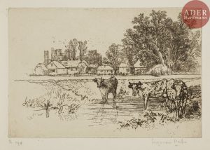 Sir Francis SEYMOUR HADEN - Cowdray Castle (with Cows). 1882. Eau-forte et pointe sèche. 151 x 240. Harrington 220 ; Schneiderman 207. Très belle épreuve sur vergé, annotée « Pl. 194 » et signée au crayon. Toutes marges. Ex-coll. H. H....