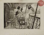James-J.-J. TISSOT - Ten Etchings / by / J. J. Tissot / first Series. A Londres, chez l’auteur. 1876. Format de l’album : 630 x 445. Eau-forte et pointe sèche. - Portefeuille comprenant 10 planches : - L’Auberge des Trois-Corbeaux....