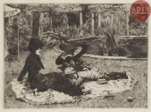 James-J.-J. TISSOT - Sur l’herbe. 1880. Eau-forte et pointe sèche. 197 x 271. Wentworth 50. Très belle épreuve sur vergé crème, légèrement oxydée. Empoussiérage, salissures claires et petites auréoles d’humidité aux bords du...