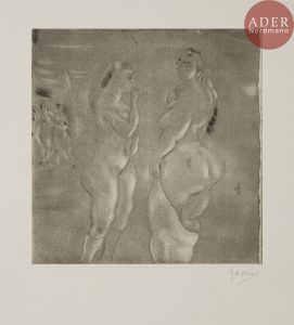Jules PASCIN (Julius Pinkas, dit) - Comparaison. 1929. Pointe sèche et aquatinte. 177 x 179. Rambert 162. Parfaite épreuve sur vélin, signée au crayon. Toutes marges.