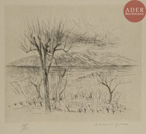 André DUNOYER de SEGONZAC - Décembre en Provence. Eau-forte. 290 x 340. Lioré et Cailler 855. Très belle épreuve sur japon, numérotée et signée à la plume et à l’encre. Fines traces de plis cassés aux bords du feuillet. Toutes marges....