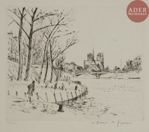 André DUNOYER de SEGONZAC - La Seine vue du quai de la Tournelle. Pointe sèche. 240 x 295. Lioré et Cailler 1260. Très belle épreuve sur vergé ancien fort, numérotée et signée à la plume et à l’encre. Toutes marges (le bord gauche...