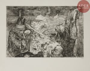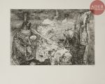 Édouard GOERG - Les Oiseaux chassés du ciel. 1938. Eau-forte et pointe sèche. 295 x 445. I.F.F. 138. Très belle épreuve sur vélin, signée, titrée et numérotée au crayon. Infime trace d’oxydation aux bords du feuillet. Toutes marges....