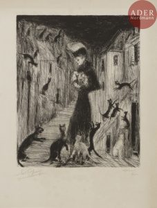 Édouard GOERG - La Femme aux chats. Vers 1930-1940. Lithographie. 240 x 193. Belle épreuve sur vélin, signée, annotée « épreuve d’artiste » et numérotée au crayon. Traces d’oxydation marginales. Rousseurs claires visibles uniquement...