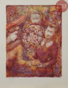 Édouard GOERG - La Femme au bouquet. Vers 1953. Lithographie. 495 x 385. I.F.F. 204. Réunion de 5 très belles épreuves sur vélin, variantes de couleurs, la 1re de la pierre-clé tirée en noir, signées et justifiées au crayon. Quelques...
