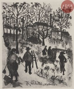 Maurice UTRILLO - Le Moulin de la Galette. Vers 1926. Lithographie. 204 x 162. Fabris 9. Belle épreuve sur vélin, oxydée à l’ouverture d’un ancien montage. Rousseurs claires éparses. Petite tache huileuse dans l’angle inférieur droit....
