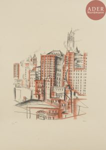 Irène RENO (Rena Hassenberg, dite) - New York (Manhattan, Municipal Building, Woolworth Building, Singer Building, Brooklyn, The Docks, Central Park). Paris, éd. Henri Basset, vers 1935. Lithographie. [503 x 660]. Impression en couleurs. Suite...