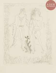 connues » selon Vallier. (Planche non retenue dans la suite Vollard et non reprise dans l’édition Maeght). Joint : La Théogonie d’Hésiode, pl. 6. 1932. Eau-forte. 300 x 220. Vallier 20 f. Parfaite épreuve sur vergé de Montval, le cuivre réduit, sans les remarques, antérieure au tirage effectué pour la galerie Maeght en 1954. Toutes marges. Ens. 2 p.