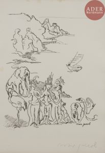 Max JACOB - Paradis impressionniste. 1928. Lithographie. 363 x 290. I.F.F. 11. Très belle épreuve sur vélin fort, signée et numérotée à la mine de plomb. Rousseurs claires et légère trace d’oxydation aux bords du feuillet. Toutes marges....