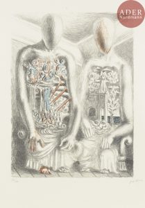 Giorgio de CHIRICO - Les Archéologues IV. (Pl. de la suite Métamorphoses). 1929. Lithographie. 403 x 303. Ciranna 16. Très belle et fraîche épreuve sur vélin filigrané « Arches », numérotée et signée au crayon. Petit enfoncement et...