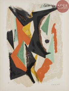Marino MARINI - Composizione. 1955. Lithographie. 616 x 410. Guastalla L 58. Impression en couleurs. Très belle épreuve sur vélin blanc, numérotée et signée au crayon. Très claire trace d’oxydation aux bords du feuillet. Toutes marges....