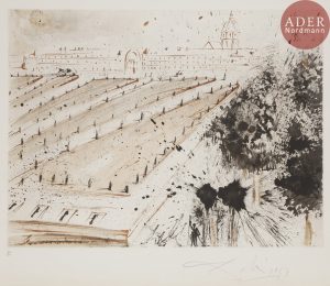 Salvador DALÍ{CR }Esplanade des Invalides. (Suite Paris, pl. 2). 1963. Eau-forte et aquatinte par Bracons. 442 x 593. Michler et Löpsinger 92. Impression en couleurs. Très belle épreuve sur vergé crème fort, légèrement oxydée, numérotée,...