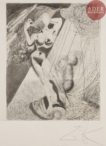 Salvador DALÍ - Aphrodite. (Mythologie, pl. 2). 1963-1965. Héliogravure et pointe sèche. 492 x 397. Michler et Löpsinger 117. Très belle épreuve sur vélin filigrané « Arches », avec un grain d’aquatinte supplémentaire sur cuivre...