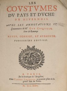 Bel exemplaire de ce commentaire des coutumes du duché de Nivernais qui connurent deux rédactions en 1490 et 1534. Le jurisconsulte Guy Coquille en fait l'étude détaillée à la fin du XVIe siècle, son travail est publié pour la première fois en 1605, deux ans après sa mort. (Dupin, Profession d'avocat, 1263, pour les éditions de Coquille des XVIIe et XVIIIe siècles).