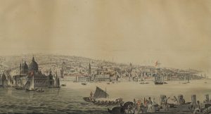 [Italie] [Venise]. Vue de Venise. Gravure rehaussée, XIXe siècle env. 60 x 45 cm. Belle vue de Venise, prise d'un quai de la Guidecca. A gauche de la composition se détache nettement la basilique Santa Maria della Salute ; plus loin, au centre,...