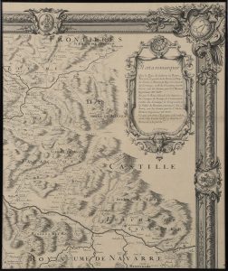 Edition originale de cette carte célèbre, plutôt déroutante pour des observateurs de notre époque : le nord est placé en bas à droite, si bien que l'on trouve Barcelone en haut et à gauche de la carte, et Bayonne en bas à droite.