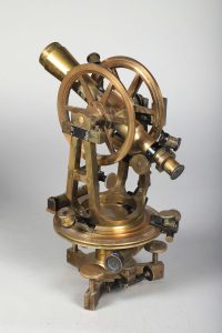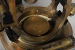 monture [H. :35 cm] en berceau porte une lunette avec deux cercles verticaux, l'un faisant contrepoids et servant pour le blocage et l'autre, pour la lecture. Cercle azimutal muni d'un niveau à bulle et deux loupes achromatiques. Trépied réglable à vis calantes. Plaque rivetée au coffret : " SL G. R. PASTOURELLE PARIS ". Bon état.