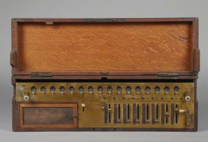 ARITHMOMÈTRE PAYEN. "L. Payen, Paris 9e, 16 rue de la Tour des Dames", [1900], boîte en chêne avec cornières et cartouche muet en laiton incrusté sur le couvercle ; mécanisme en laiton, métal et os. Machine à calculer à 6 scripteurs,...