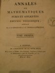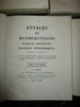 Oeuvre capitale de Gergonne (1771-1859), professeur d'astronomie à la Faculté de Montpellier, les Annales furent fondées à Nîmes en collaboration avec J.E. Thomas-Lavernède ; il s'agit du premier journal de mathématiques pures et surtout du seul périodique en langue française consacré aux mathématiques pures. Il deviendra à partir de 1836, sous la direction de Joseph Liouville, le Journal de mathématiques pures et appliquées.